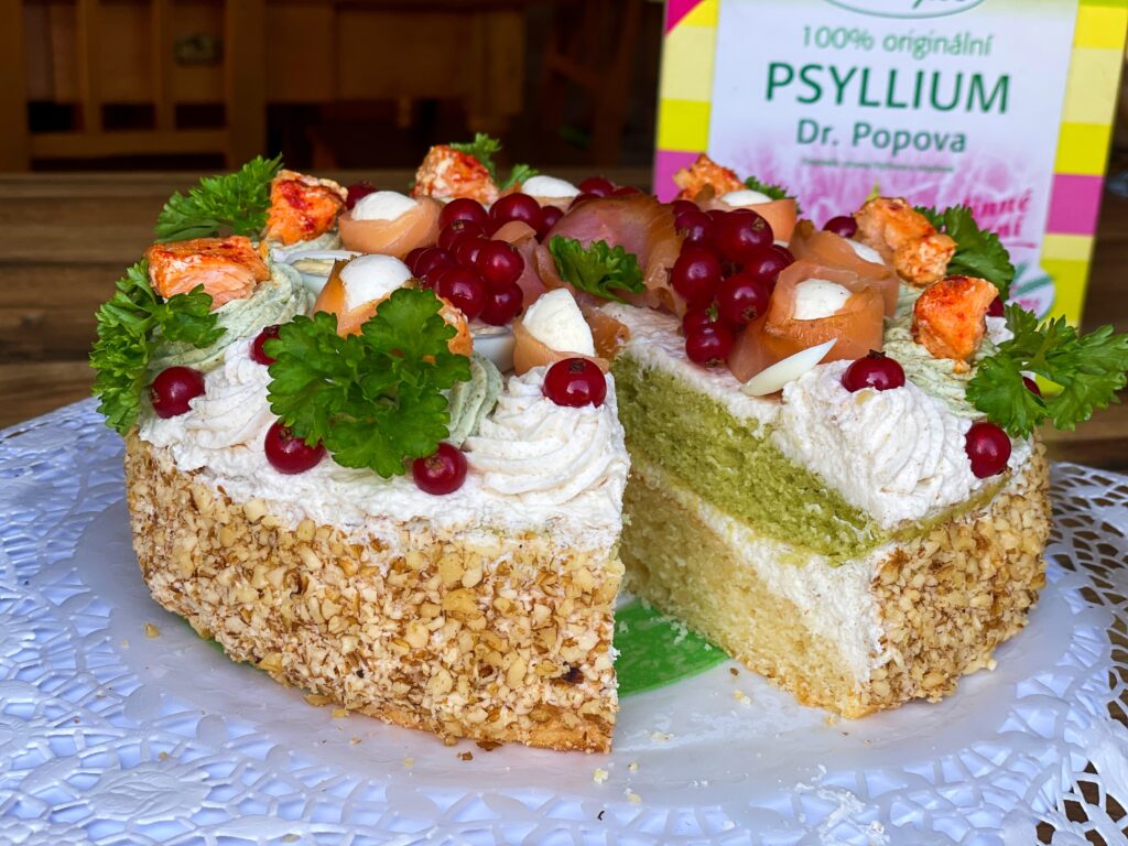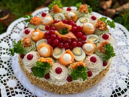 Opět může být pomazánka různá. K sýrové pomazánce se hodí ozdobit uzeným lososem, mozzarellou, slanečkem z lososa a křepelčími vejci. Dort je ještě dozdoben – 40 g sekaných vlašských ořechů, petrželka, červený rybíz nebo granátové jablko.