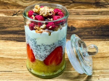 Ovoce rozmixujeme, přidáme Psyllium Dr. Popova Na vaření k zahuštění, tím pádem získáme i více vlákniny. Přisladit můžeme medem, čekankovým sirupem nebo pro diabetiky doporučujeme erythritol. A máme hotovo, můžeme plnit skleničky. Takto připravenou marmeládu můžeme použít na moučníky, na chleba a nebo, jak je tomu v našem případě, do pohárů v kombinaci s chia semínky a domácím kefírem. Dozdobit můžeme tvarohem a ovocem.