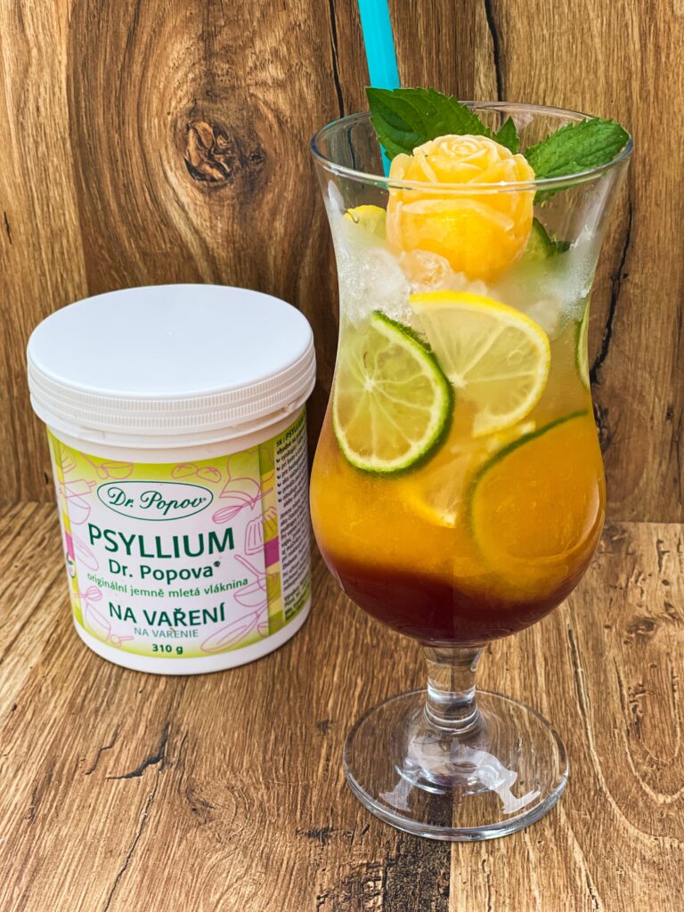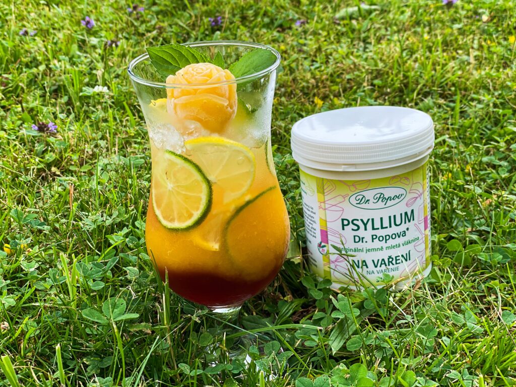 Psyllium Dr. Popova Na vaření je úžasně jemné, proto s ním můžeme vytvářet husté sirupy rovnou z čerstvého ovoce. Tento sirup je z broskví a skvěle nahradí i velmi drahý, barmanský sirup. Koktejl je úžasně osvěžující a díky vláknině je z něj i skvělá, letní svačinka která zasytí, dodá vitamíny a minerály.