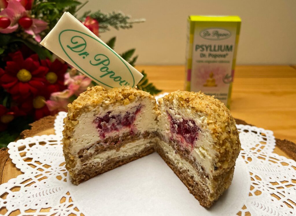Vejce rozdělíme na bílky a žloutky, z bílků vyšleháme sníh, žloutky s čekankovým sirupem a smícháme dohromady s ořechy a psylliem. Na plech s pečícím papírem nalijeme těsto. Pečeme v předehřáté troubě na 180°C 10 minut. Vykrájíme větší kolečka, naplníme a ozdobíme krémem s náplní z malinového želé. Opatrně obalíme sekanými vlašskými ořechy a vytvarujeme kouli.