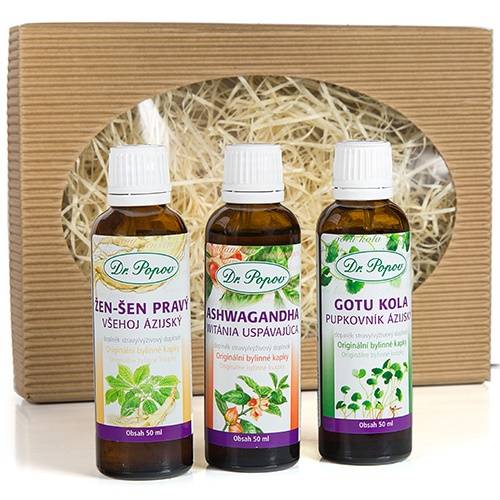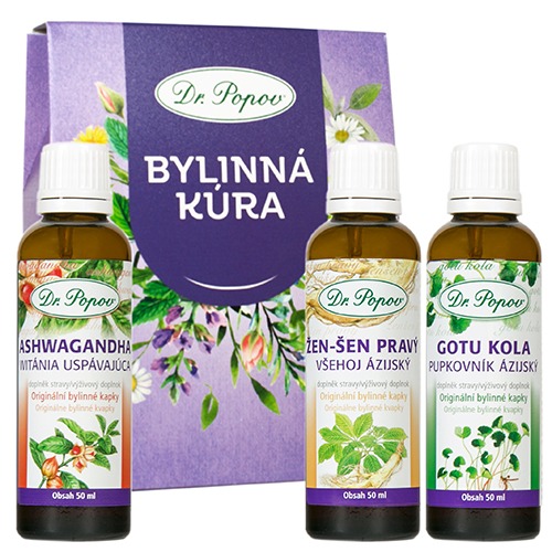 Bylinná kúra Dr. Popova Dlouhověkost obsahuje kapky Žen-šen, Ashwagandhu (Vitánii snodárnou) a Gotu kolu (Brahmi, Pupečník asijský).