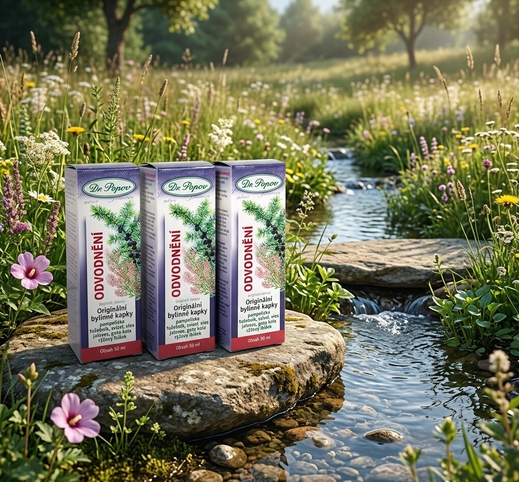 Originální bylinné kapky Dr. Popova Odvodnění obsahují 7 bylin známých pro svoje účinky na funkci močových cest, vylučování vody z organismu a zmírnění pocitu těžkých nohou.
