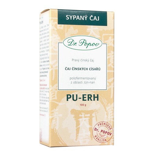 Pu-Erh Dr. Popova je černý s výraznou chutí a silnou vůní. Pěstuje se v čínské provincii Jün-nan a zpracovává se speciální fermentací čaje. Pu-Erh přispívá ke kontrole tělesné hmotnosti a duševní pohodě. Má velmi nízký obsah kofeinu a tak se hodí i k večernímu pití. Jeho neopakovatelnou lehce kouřovou chuť si snadno zamilujete.