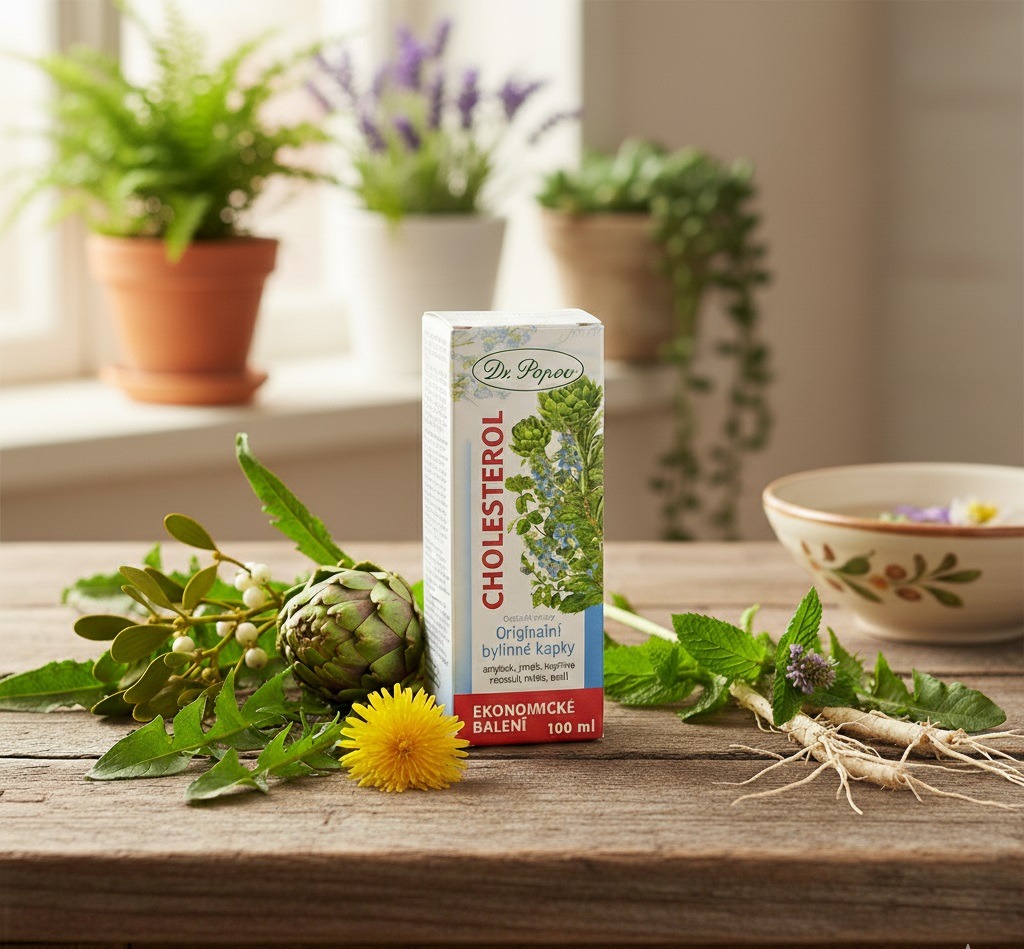 Převezměte kontrolu nad svým cholesterolem – přirozeně! Originální bylinné kapky Dr. Popova Cholesterol v sobě spojují tradičně užívané byliny, jednou ze základních je jmelí. Tu jsme vybrali hlavně proto, že podporuje zdravou hladinu lipidů v krvi a přispívá k metabolismu tuků (cholesterol). Jmelí má antioxidační účinky a podílí se na správném fungování cévní soustavy. Artyčok udržuje hladinu krevních tuků v rovnováze a játra díky němu pracují tak, jak mají. Pýr a pampeliška podporují zdravé trávení, pampeliška navíc udržuje správné fungování žaludku a jater, napomáhá vylučování a působí antioxidačně. Máta se podílí na zdravé činnosti trávicí soustavy a fungování střev. Pampeliška, pýr a máta = Komplexní podpora pro vaše trávení a játra.
