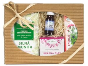 Srdce každé ženy zaplesá, když spatří tento krásný dárkový balíček. Dárek pro ženy obsahuje Funkční čaj Silná imunita, voňavou silici Litsea cubeba, přírodní regenerační balzám Krásná pleť a Bylinné kapky Energie.