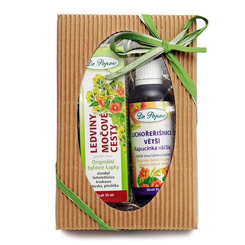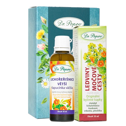 Dárková kazeta Zdravé močové cesty obsahuje originální bylinné kapky Dr. Popova Ledviny – močové cesty a také kapky s tradičně užívanou Lichořeřišnicí větší.