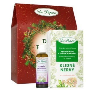 Balíček obsahuje Funkční čaj Klidné nervy a Bylinné kapky Dr. Popova Kozlík s mučenkou