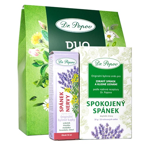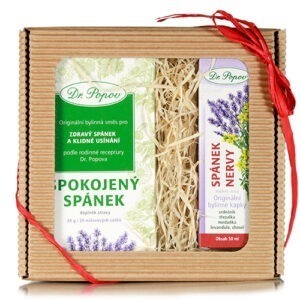 Balíček obsahuje Funkční čaj Spokojený spánek a Bylinné kapky Dr. Popova Spánek nervy. Relaxační bylinky pro klidný a spokojený spánek, díky kterým vaše duše pookřeje.
