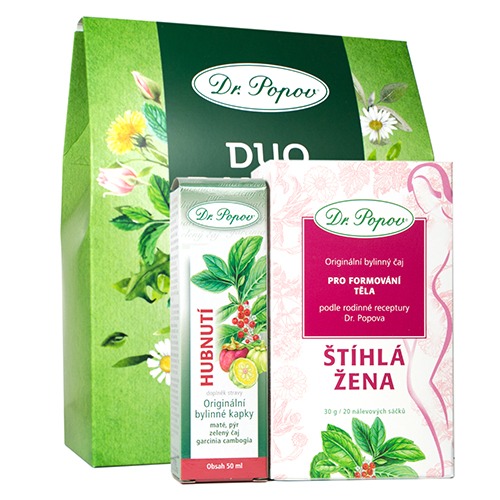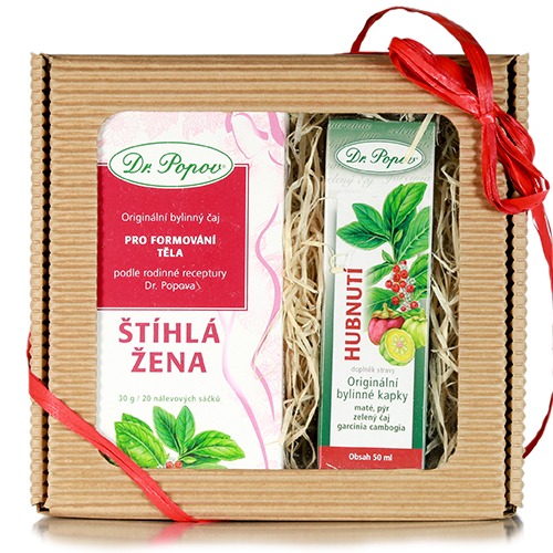 Balíček obsahuje Funkční čaj Štíhlá žena a Bylinné kapky Dr. Popova Hubnutí. Snem každé ženy je mít ladné křivky. Pomozte si k formování postavy správnou kombinací bylinek.