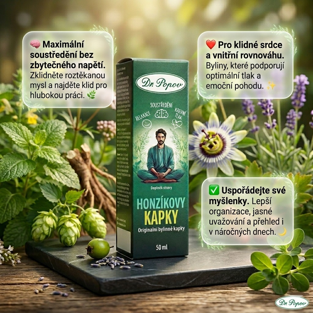 ,,Dlouho jsem hledal způsob, jak zklidnit roztěkané myšlenkové pochody, dobře se soustředit, lépe si zorganizovat myšlenky a jasně uvažovat. Proto vznikly Honzíkovy kapky. 💧 Není to jen další doplněk, je to moje rituální záležitost, podrží mě, když potřebuju máknout, ale i když cítím, že mi srdce buší víc, než je zdrávo. Klidná hlava a tlak v normě jsou základ všeho. Vyzkoušejte sílu přírody, kterou nosím v kapse.“