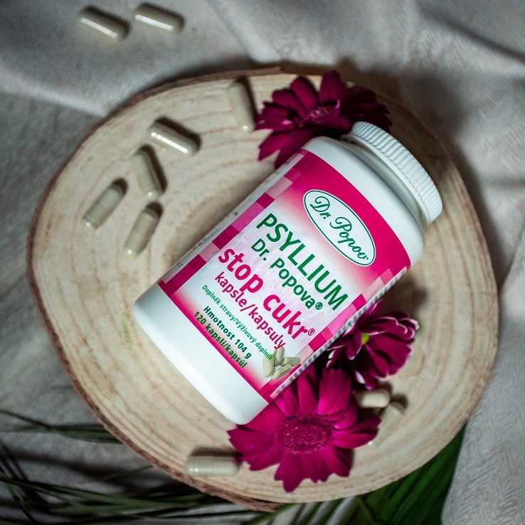 - Psyllium Dr. Popova STOP CUKR kapsle obsahují směs vysoce kvalitní rozpustné vlákniny a další vybrané bylinné složky (extrakt z gymnemy lesní, skořice a smetanky lékařské) pro optimální hladinu krevního cukru.