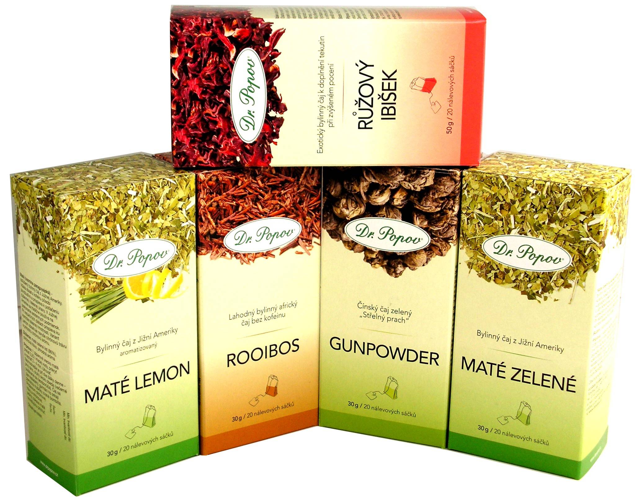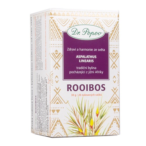 Bylinný čaj Rooibos Dr. Popova je lahodný africký čaj bez kofeinu, známý pro svoje účinky po celém světě. Rooibos pochází z Jižní Afriky, jedná se o vytrvalou rostlinu pověstnou povzbuzujícími účinky a skvělou chutí. Obsahuje vysoké množství minerálních látek (měď, železo, draslík, hořčík, vápník) a antixodiantů. Nevyvolává nespavost, protože neobsahuje kofein. Z toho důvodu je výborným nápojem i pro děti, těhotné ženy a osoby s vysokým krevním tlakem.