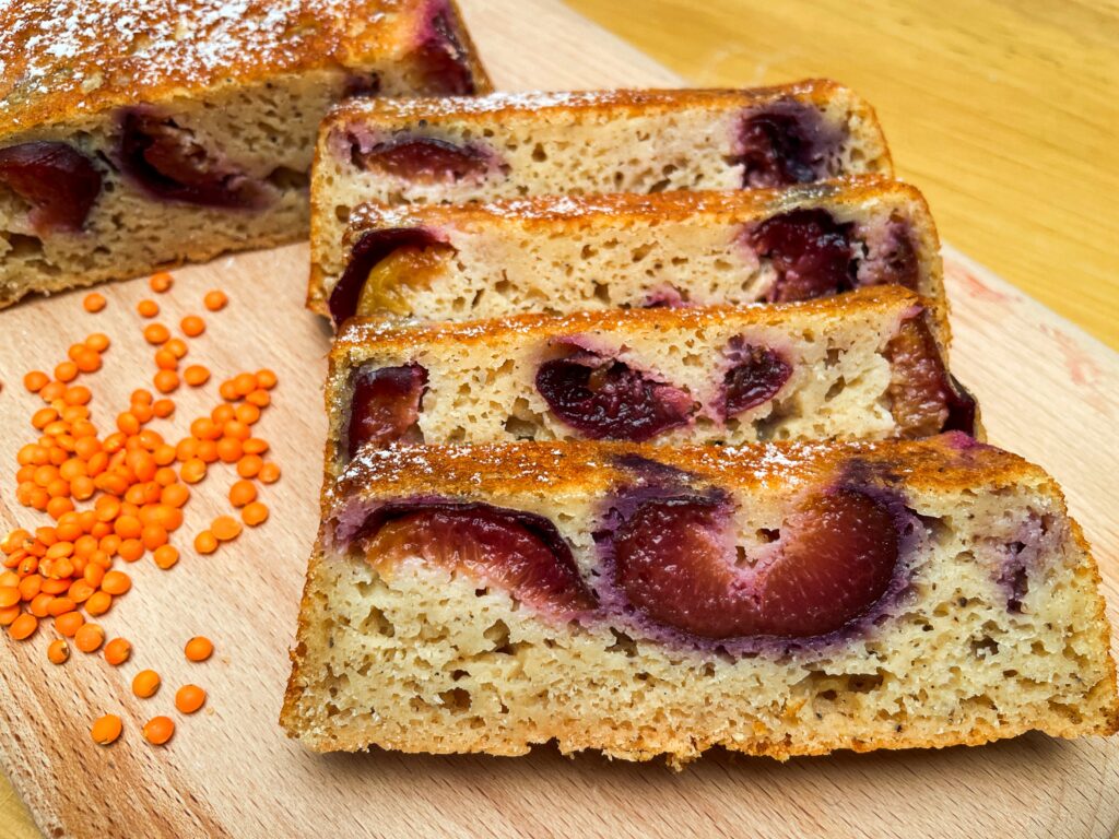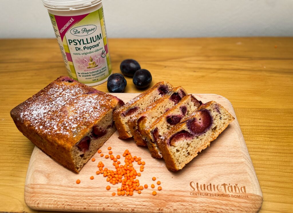 20 dkg červené čočky namočte na pár hodin, přebytečnou vodu slejte. Rozmixujte s 1 plnotučným tvarohem, dvěma vejci a lžičkou oleje. Nastrouhejte do misky 3 dkg sýra a 2 dkg parmazánu (dochutit bylinkami podle chuti, nebo jen sýrová příchuť) a smíchejte s velkou lžící psyllia Dr. Popova, práškem do pečiva a zalijte polovinou čočkové hmoty. Dobře rozmíchejte, nalijte do silikonové formy vymazané tukem. Druhá část zůstala v mixéru, tak do ní přidejte vanilku, lžíci Erythritolu, lžíci psyllia Dr. Popova smíchanou s práškem do pečiva a nalijte do druhé vymazané formy. Přidejte švestky a dejte obě formy do předehřáté trouby na 160°C pečte pozvolna 45 minut.