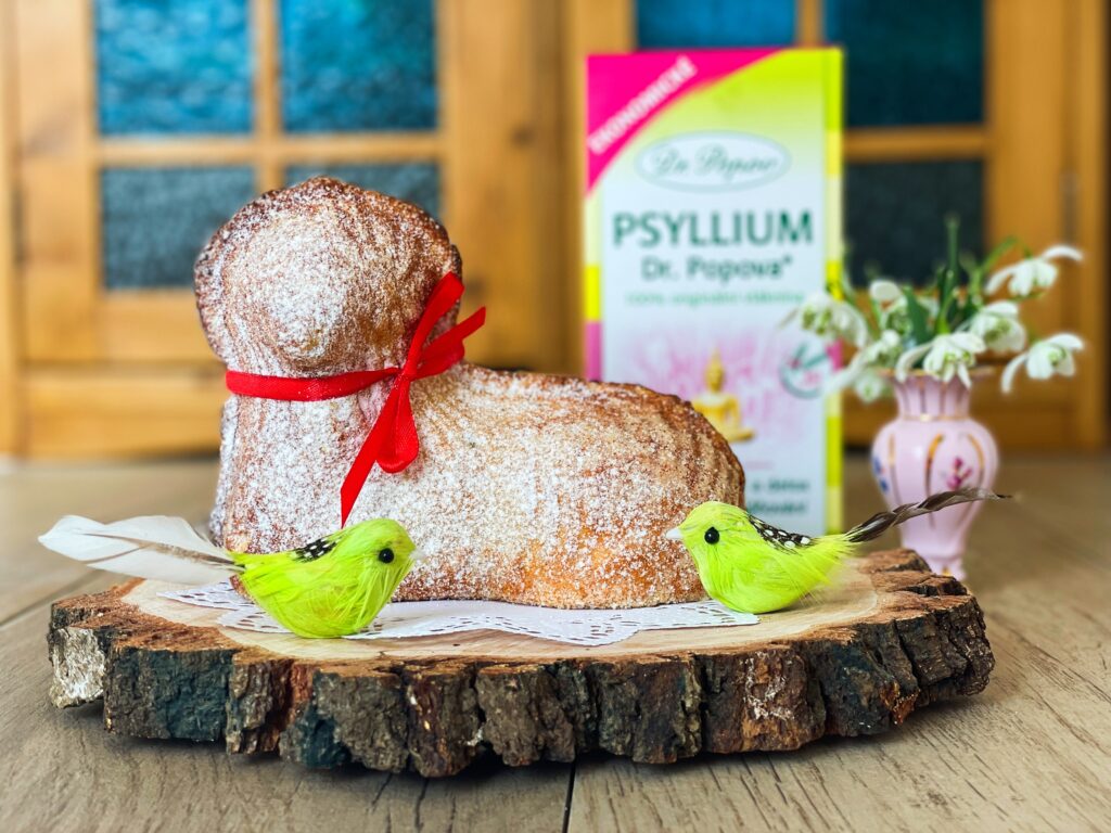 Oddělíme žloutky od bílků a z bílků vyšleháme tuhý sníh. Do žloutků přidáme slazení, vanilku, citrónovou kůru a šleháme do pěny. Při šlehání přidáme postupně dvě polévkové lžíce vařící vody. Potom přidáme rozinky a smíchanou mandlovou mouku s psylliem. Postupně a opatrně přidáváme sníh, aby těsto spadlo co nejméně. Formu vymažeme kokosovým olejem, vysypeme mandlovou moukou a těsto nalejeme do formy. Pečeme na 170°C v předehřáté troubě 30 minut.