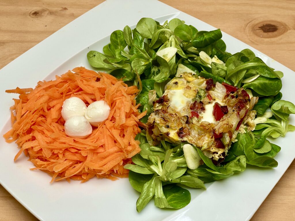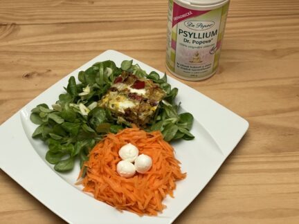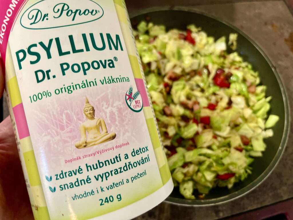 Klasická velikonoční nádivka u nás letos nebude, zelí je lepší a zdravější. Zpěnit cibulku, přidat uzené, pepř, nakrájenou červenou papriku, zelí osmahnout, přidat lžíci Psyllia Dr. Popova, pár kopřiv a zamíchat. Potom přendat do vymazaného pekáčku a zalít vajíčkem a zapéct. Salátky podle chuti.